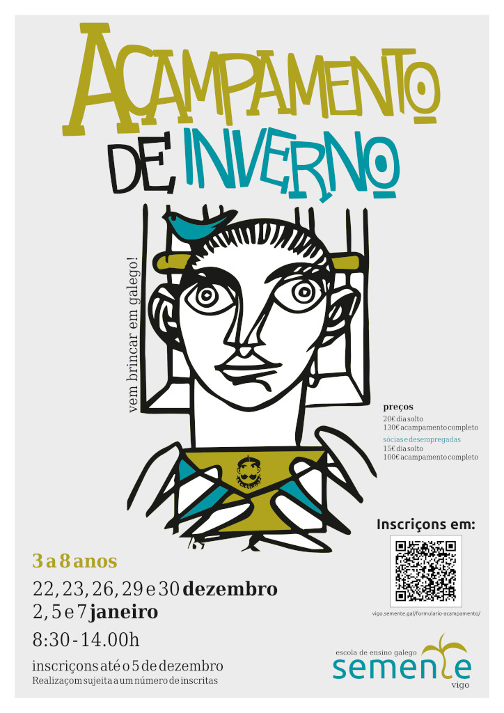 Aponta/te ao acampamento de inverno na Semente Vigo Datas: 23, 24, 26, 27, 30 e 31 de dezembro. 2 e 3 de janeiro. Horario: de 08:30h a 14:00h. Lugar: Doutor Corbal 102 (Teis). Idades: De 3 a 8 anos Vagas limitadas.